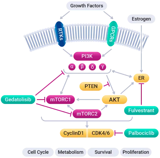 Simultaneous inhibition of the PAM (PI3K/AKT/mTOR) pathway with gedatolisib, the CDK4/6 pathway with palbociclib, and the estrogen receptor pathway with fulvestrant, is intended to disrupt complex cooperation between these pathways to inhibit tumor growth.